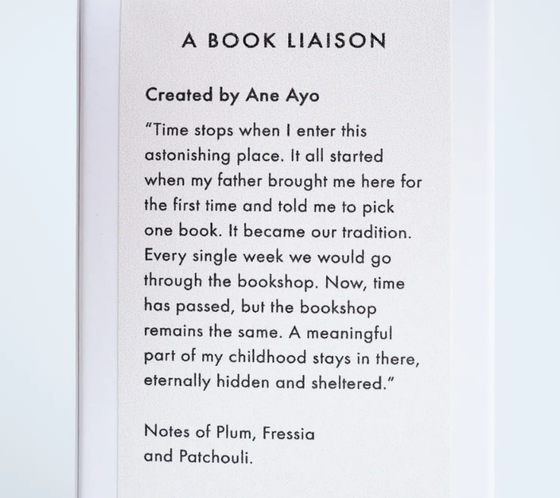 Над ароматом работала парфюмер Ане Айо. На оборотной стороне флакона приводится ее история о том, что вдохновило ее на создание Liaison in Lisbon. «Все началось с того дня, когда отец впервые привел меня сюда и предложил выбрать книгу. С тех пор это стало традицией. Каждую неделю мы приходили в книжный магазин и наслаждались огромным разнообразием книг, ожидающих, когда же их прочтут».