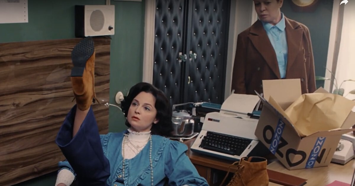 Сцена из фильма «Служебный роман», где секретарша Верочка знакомит ЛюдмилуПрокофьевну (Мымру) с модными тенденциями, давно разошлась на цитаты.Маркетплейс Ozon решил осовременить комедию Эльдара Рязанова и снял собственнуюверсию этой сцены. Как можно догадаться, ответ на вопрос «Что сейчас носят?»героиня находит в интернет-магазине.