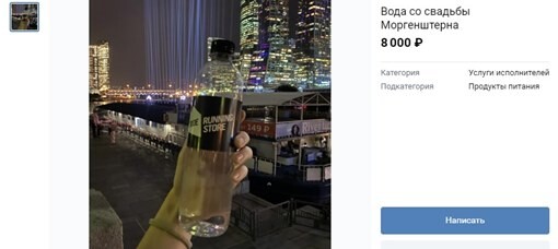 В сервисе «Объявления» социальной сети VK было опубликованопредложение по продаже бутылки воды со свадьбы исполнителяМоргенштерна, которая состоялась 31 августа. На прикрепленной к объявлениюфотографии видно, что бутылка наполовину пустая, а в комментариях продавецнаписала: «Не целая! Вода с коробок свадьбы Моргенштерна». Цена за товарсоставляет 8000 руб.