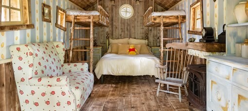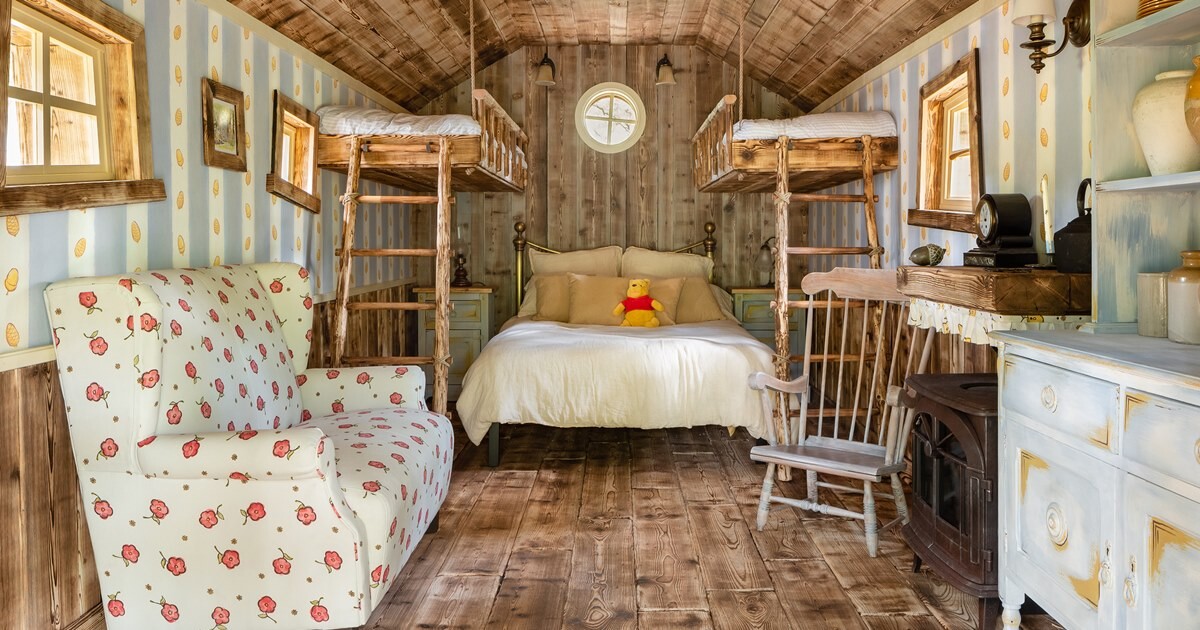 Помимо оригинальных деталей из сказки про Винни-Пуха, дом включает в себя двуспальную кровать на первом этаже, мезонин с двумя односпальными кроватями и гостиную с обеденной зоной.