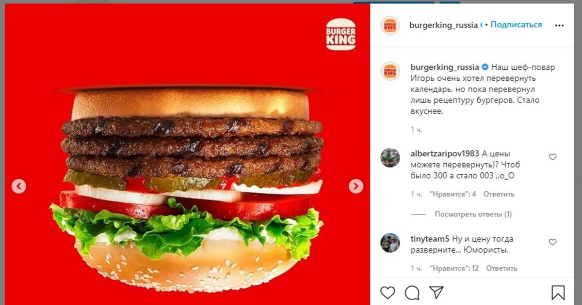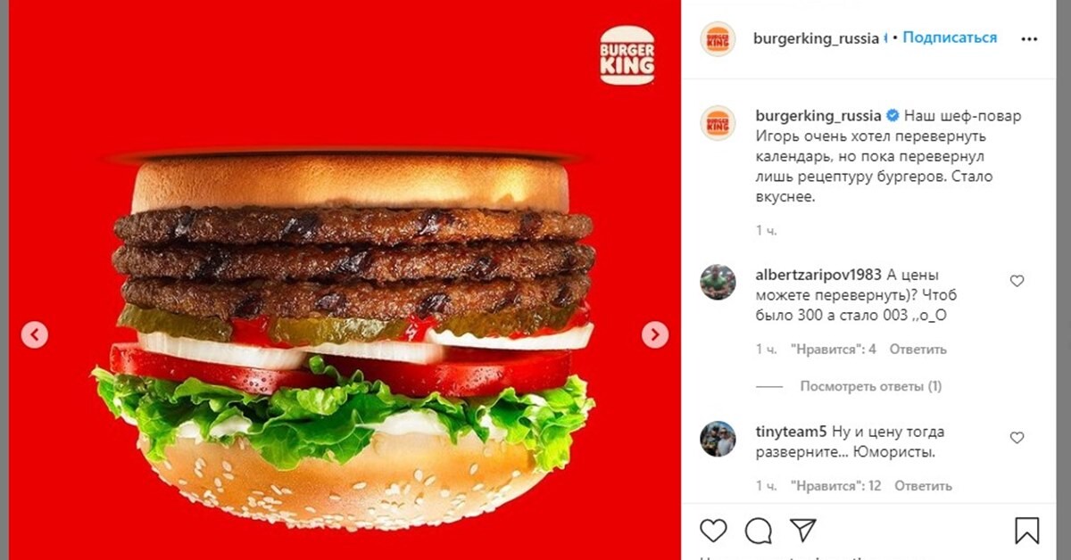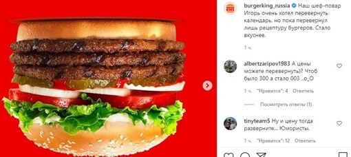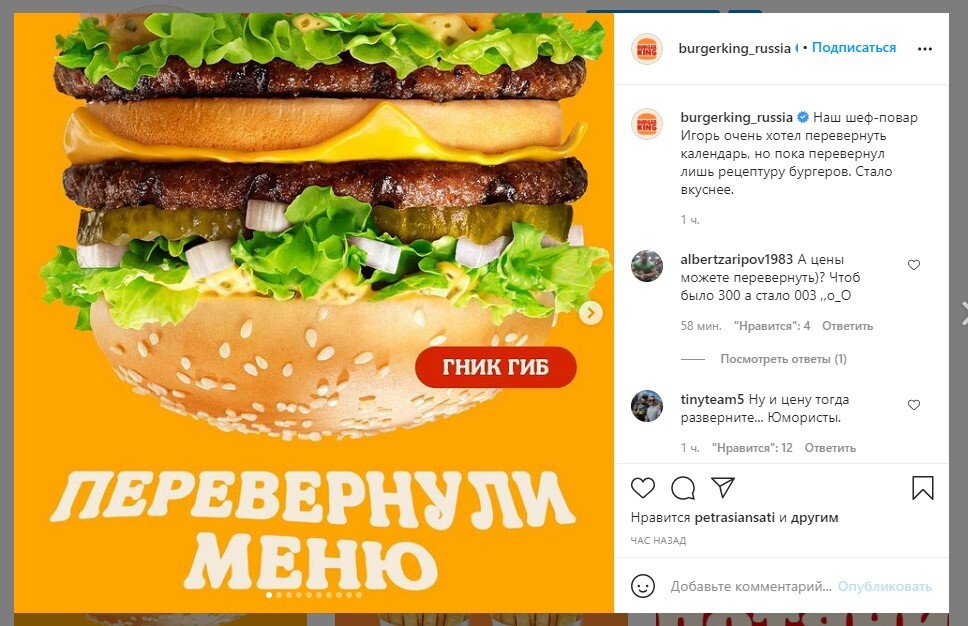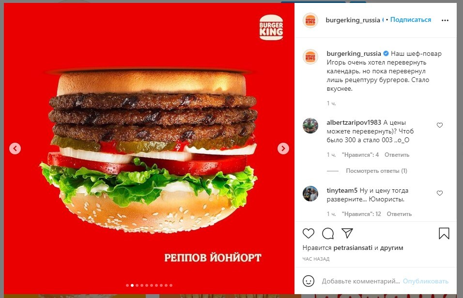 Burger King в своем Instagram «перевернул меню» и показал свои бургеры в перевернутом положении и с отзеркаленными названиями. «Наш шеф-повар Игорь очень хотел перевернуть календарь, но пока перевернул лишь рецептуру бургеров», — написала компания под постом.