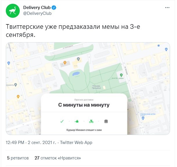 Компания Delivery Club в этом году тоже показала скриншот, на котором чей-то заказ доставляет курьер Михаил, и подписала: «Твиттерские уже предзаказали мемы на 3-е сентября».