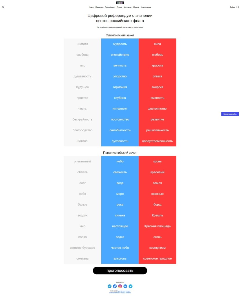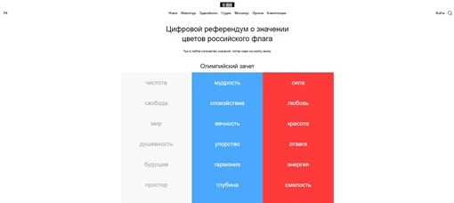 На сайте студии Артемия Лебедевапоявилсяцифровой референдум о значении цветов российского флага. Ассоциациюк каждому цвету государственного знака можно выбрать в двух категориях:олимпийский зачет и паралимпийский зачет. Например, из значений белого цветадля олимпийского зачета можно выбрать из вариантов «свобода», «мир», «чистота»и др. В паралимпийском зачете у этого цвета представлены ассоциации «сметана»,«светлое будущее» или «водка».