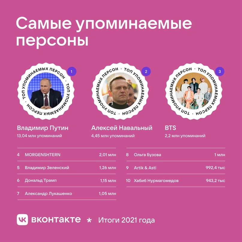 Путин, Навальный, BTS: «ВКонтакте» составила рейтинг персон 2021 года