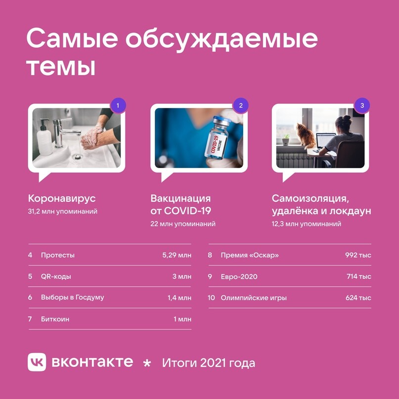 Самой волнующей темой оказался коронавирус: связанные с ним вопросы занялипервые места рейтинга. Их обсуждали в записях и комментариях суммарно 68,5 млнраз. Также пользователи писали про вакцинацию, удаленную работу, осеннийлокдаун и QR-коды.