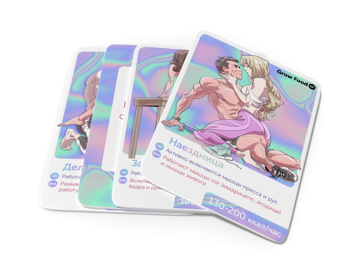 Сервис доставки здоровой еды Grow Food выпустил настольную игру для взрослых«Фитнесутра» по мотивамизвестной «Камасутры». Игра состоит из 30 карточек: 15 из них содержатизображения поз из «трактата любви», переделанных в спортивные упражнения. Наних указаны групп мышц, которые прокачиваются при выполнении позы, а такжезатраченные при этом калории. Еще на 15 карточках написаны небольшие текстовыезаданиями для пар.