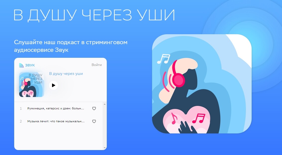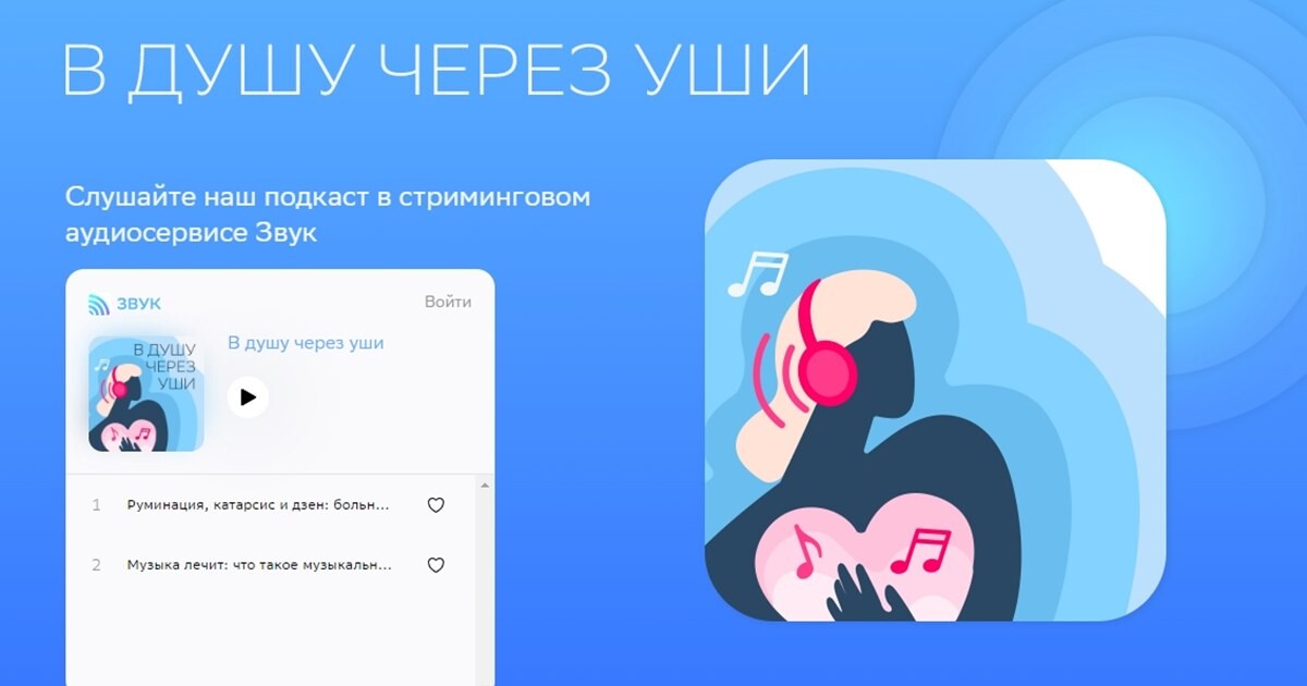 В рамках проекта также выйдет серия подкастов с названием «В душу через уши»о влиянии музыки на ментальное здоровье. В каждом выпуске музыкальный эксперт«Звука» Илья Воронин, психологи из «СберЗдоровья» разберут с гостями феноментворчества и как музыкальная терапия помогает справиться с проблемамиментального здоровья. В записи подкастов также приняли участие звездные гости,например певица Сюзанна.