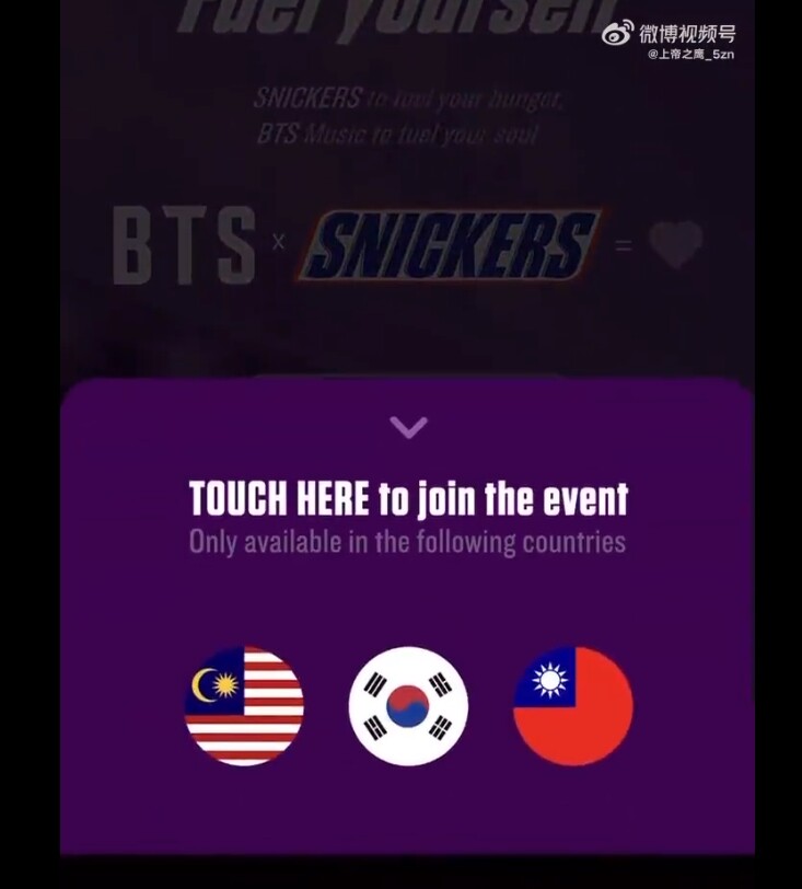 Это произошло после того, как на китайской платформе Weibo завирусилисьвидео и фото с мероприятия, рекламирующего ограниченный выпуск батончикаSnickers, который, был доступен только в «странах» Южной Кореи, Малайзии иТайваня.