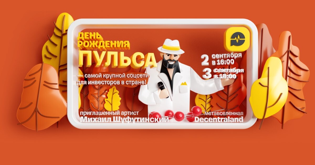 Социальная сеть для инвесторов «Пульс» от «Тинькофф Инвестиций» отметит вметавселенной Decentraland свое трехлетие. В честь этого события платформапроведет в онлайн-пространстве концерт Михаила Шуфутинского. Выбор исполнителякомпания объяснила тем, что день рождения соцсети совпадает с названиемпопулярного хита артиста — 3 сентября.