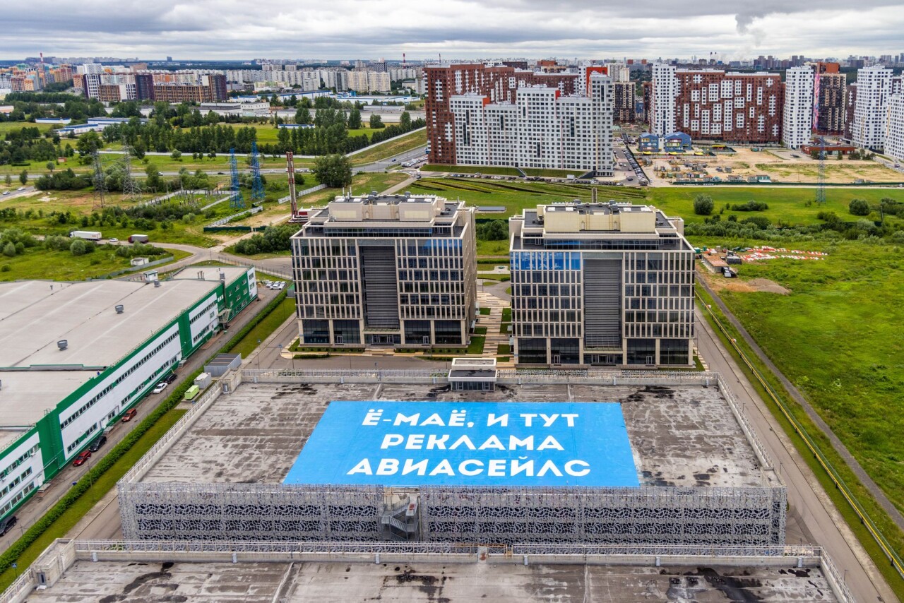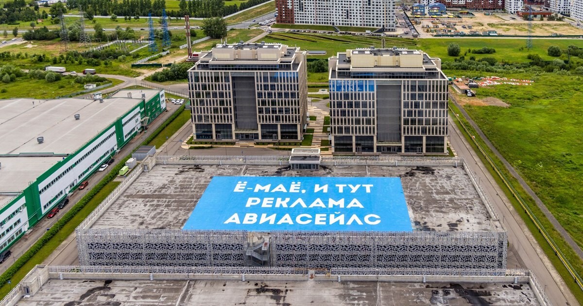 Сервис для покупки авиабилетов «Авиасейлс» нарисовал рекламное граффити«Е-мае, и тут реклама 'Авиасейлс'» площадью 2 тыс. кв. м. на крыше одного иззданий под глиссадой московского аэропорта Внуково.