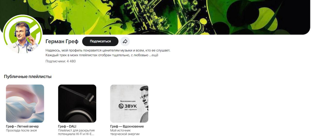 Ранее Герман Греф уже публиковал на платформе свои плейлисты под названиямиDali и «Вдохновение», но они не были привязаны к его профилю.