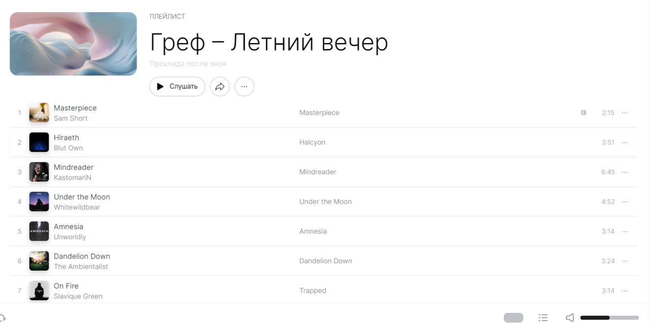 Летняя подборка от Грефа состоит из спокойных треков в стиле чиллаут. Вплейлисте есть работа композитора Aurora Night, музыкальная пьеса от Blut Own,композиция от проекта The Ambientalist, электронная музыка Slavique Green, трекLonely российского продюсера Notan Nigres и другие.