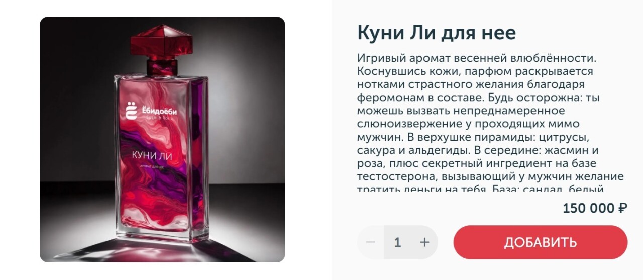 В онлайн-меню сервиса по доставке суши и роллов «Ёбидоёби» появились женскийпарфюм «Куни Ли» стоимостью 150 тыс. руб. Для женщин компания обещает игривыйаромат весенней влюбленности с феромонами в составе. В компании заявили, чтоесли человек не может сказать словами, что хочет от второй половинки –используй парфюм.