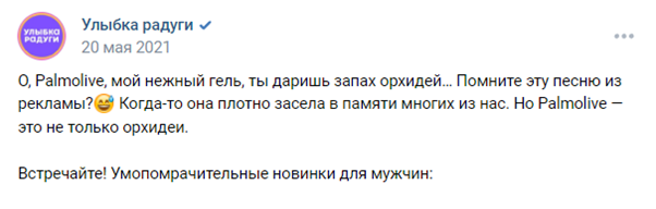 В рекламном ролике геля для душа Palmolive девушка в ванной начинает петь:«О, Palmolive, мой нежный гель, ты даришь запах орхидей. Я в восторге простотаю, в удовольствие улетаю». Первые строчки песни начали «заедать» у аудиториии стали мемом.