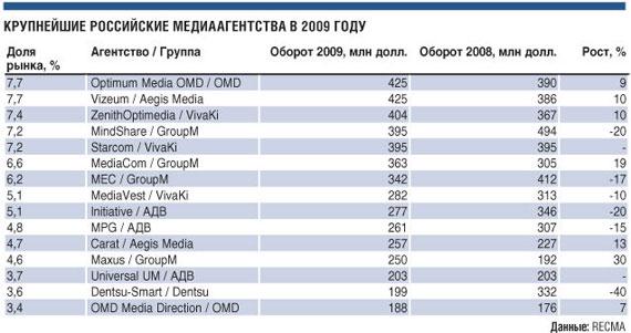 Согласно рейтингу RECMA, лидерами рынка в прошлом году были агентства Optimum Media OMD группы OMD и Vizeum группы Aegis Media, которые показали рост около 10% и одинаковый оборот в 425 млн долл. На третьей строчке рейтинга RECMA оказалась ZenithOptimedia группы VivaKi с ростом 10% и оборотом 404 млн долл. Однако агентства вели себя в кризис неоднородно даже в пределах одной рекламной группы. Если MindShare в холдинге GroupM сократила свой оборот на 20%, до 395 млн долл., то Maxus увеличила на 30%, до 250 млн долл. По данным АКАР, суммарный объем рекламы в России сократился в прошлом году на 27%, до 255,7 млрд руб. (около 8 млрд долл.).