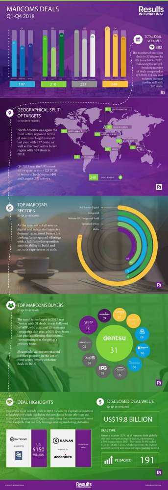По итогам всего 2018 г. было совершено 882 M&A-сделки в маркетинговой отрасли, пишет The Drum со ссылкой на отчет RI. Наибольшее количество сделок (377) было заключено в Северной Америке.