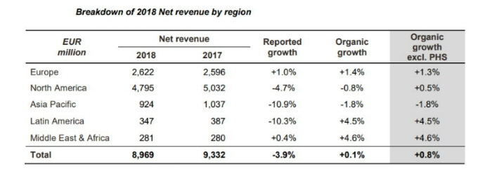 Даже без результатов проданной PHS холдинг не смог добиться роста выручки на 2,5%, спрогнозированного аналитиками Seeking Alpha. За весь год показатель составил в денежном выражении 9 млрд евро. В постоянной валюте годовая выручка упала на 3,9%, однако с учетом колебаний валют рост составил 0,1%, отмечается в отчете.