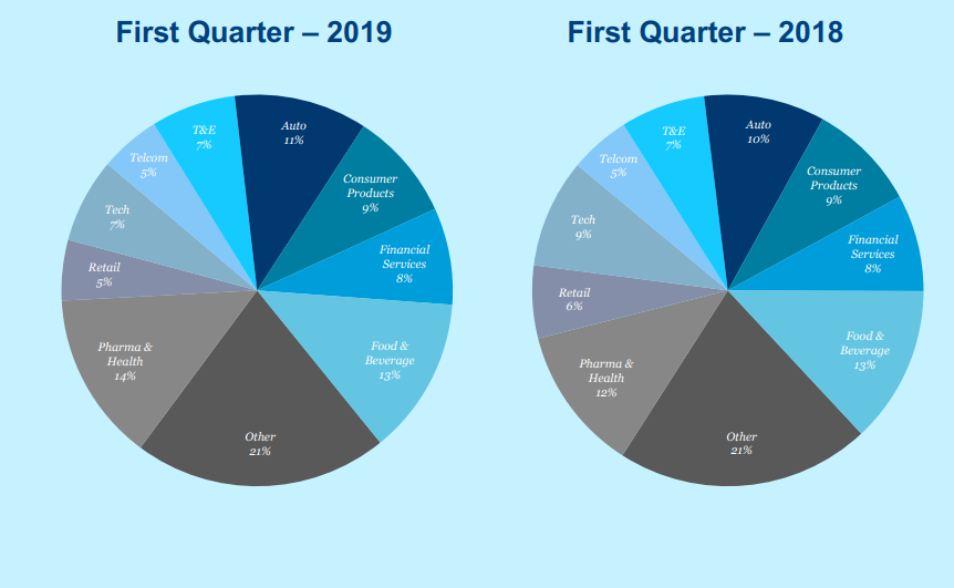 Большую часть выручки холдингу приносят бренды из фармацевтического сектора, который составил 14% в структуре выручки компании. На категорию еды и напитков приходится 13%, на автомобильный сектор — 11%, непищевые потребительские продукты — 9%, на финансовый сектор — 8%.