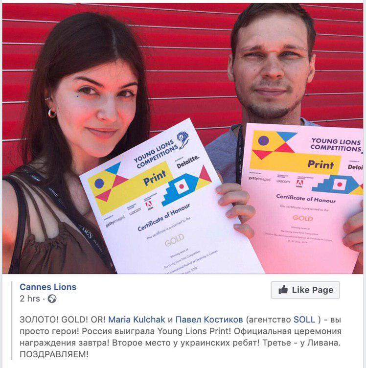 Российское креативное агентство «Соль» получило золото фестиваля Young Cannes Lions за работу в номинации Print («Печатная реклама»).