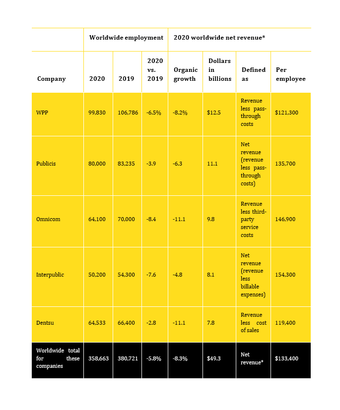 В 2020 г. пять крупнейших рекламных холдингов сократили 22 тысячи рабочихмест, что составляет 5,8% их штата. По даннымAd Age Datacenter, к концу года совокупное числосотрудников WPP, Publicis, Omnicom, Interpublic и Dentsu снизилось до358663.