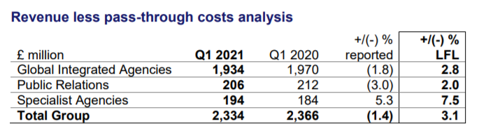 Выручка WPP по итогам первого квартала увеличилась до 2,9 млрд фунтовстерлингов. Рост с начала года составил 1,8%. Сопоставимые (LFL) доходы вырослина 6,3%. Выручка за вычетом издержек составила 2,3 млрд фунтов (динамика –1,4%и +3,1% соответственно).