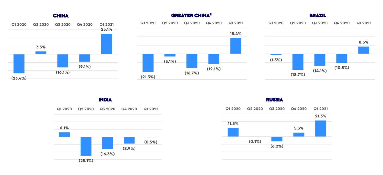 Среди стран БРИК лучшая динамика наблюдалась в России, где бизнес WPP подросна 21,3%. Сопоставимая выручка также увеличилась в Китае (+18,4%) и Бразилии(+8,5%). В Индии динамика была близка к нулю.