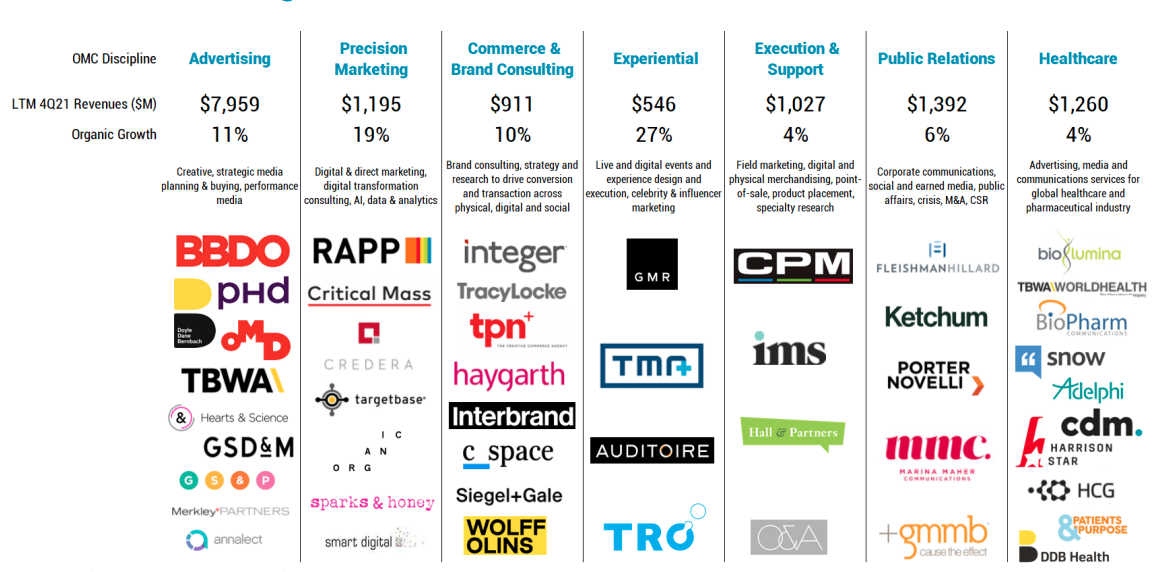 Наиболее заметный вклад в выручку Omnicom Group вынесли следующие категориирекламодателей: «Фарма и Здравоохранение» (15%), «Еда и Напитки» (14%),«Технологии» (11%) и «Автомобили» (10%).