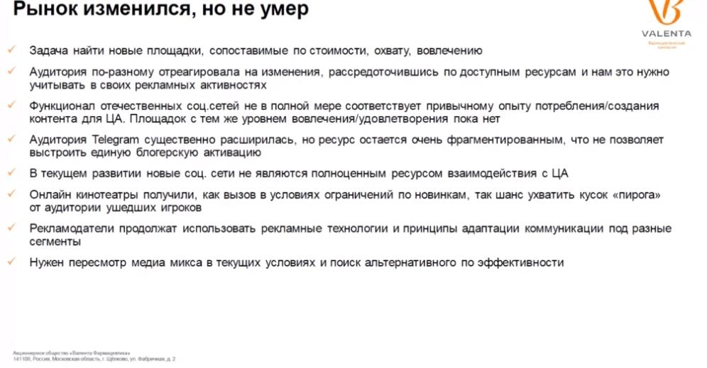 — Как изменился рынок для рекламодателя. «Ни одна из площадок насегодняшний день в полноценной степени не компенсирует те показателивовлеченности взаимодействия с контентом, которые мы ощущали как бизнес наплощадках, с которых эта миграция произошла», — Снежана Черногорцева,заместитель генерального директора по маркетингу и продажам «Валента Фарм».