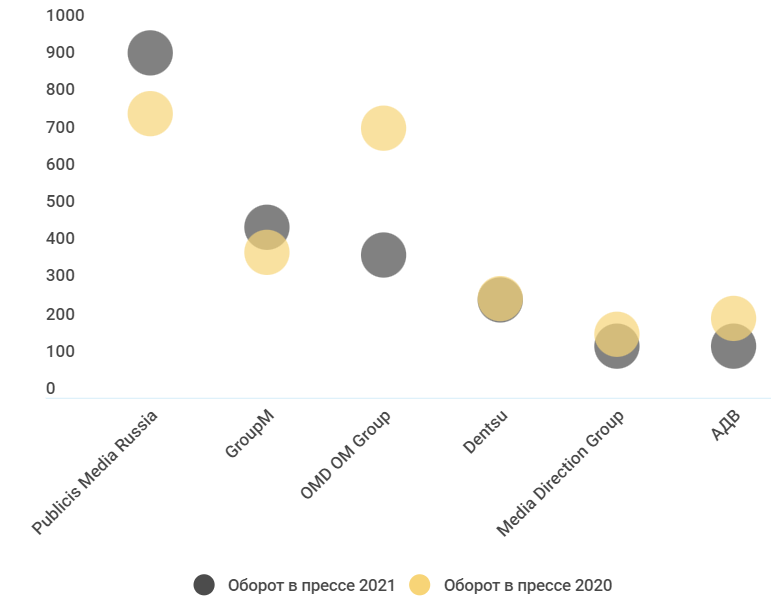 Значительную динамику показало за пять лет Dentsu X,переместившись с 25-го места в 2017 году на 6-е в 2021. Это произошло благодарязаключению договоров с топовыми рекламодателями.
