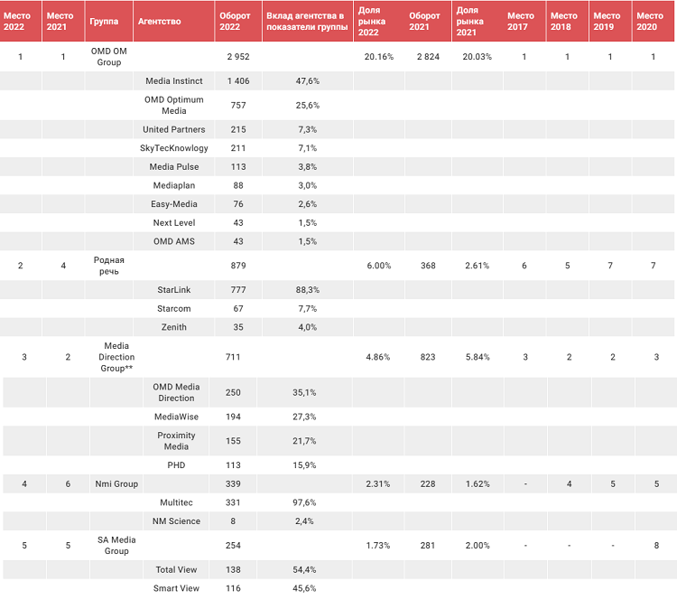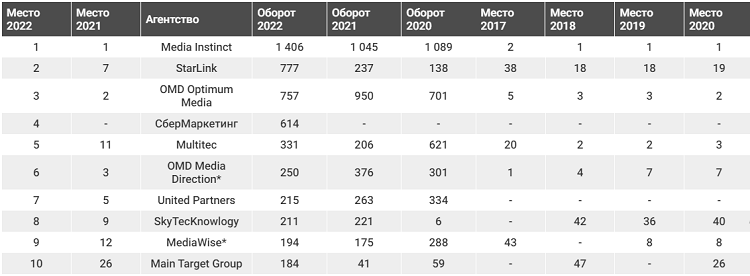 Из компаний, ранее в рамках шестилетнего периода хоть раз входивших втоп-10, но к 2022 г. выбывших из десятки лидеров, можно отметить Total View,Mediaplus, Mediaminded, PHD, OMD AMS, Carat и DentsuX.