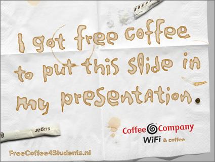 Рекламными носителями теперь становятся сами потребители. Целевая аудитория — старшеклассники и студенты. За бесплатный кофе молодые люди размещают в презентации к своим докладам рекламные слайды сети кофеен. При этом сами слайды сделаны, как надо: в меру агрессивные, в меру смешные. В итоге, это становится модным (подростковое стадное чувство еще никто не отменял), и, как результат, — флаер есть уже в каждой презентации. А то, что каждый бесплатный кофе окупился сотней платных, сомнений не вызывает