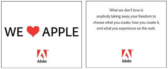 В рекламной кампании под названием Freedom of Choice (свобода выбора) говорится, что Adobe любит Apple, однако тут же утверждается, что производитель iPhone ущемляет свободу пользователей, не давая им возможности пользоваться Flash на фирменных мобильных устройствах. Интересно, что данная реклама распространяется не только во Всемирной Паутине, но и через влиятельную газету Washington Post, в недавнем выпуске которой под нее отведена целая страница.