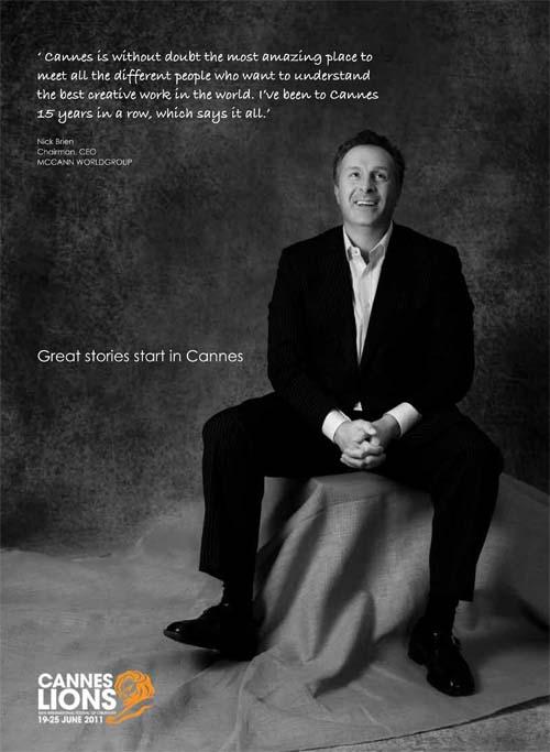 Уже можно посмотреть видео Боба Гринберга (председатель, CEO и CCO R/GA), Юджина Бэйа (председатель VBAT), Фернандо Вега Олмоса (председатель JWT Worldwide), Марселло Серпа (CCO AlmapBBDO) и Стефана Ксиберраса (президент и управляющий креативный директор BETC Euro RSCG) или посмотреть принты Ника Брайана (председатель и CEO McCann Worldgroup), Армина Йохума (партнер и CCO Jung von Matt), Прасуна Джоуши (управляющий председатель McCann Erickson), Тома Бекмана (управляющий креативный директор Prime). Кампания будет идти на нескольких языках (английский, французский, немецкий, португальский и испанский) и состоять из принтов и коротких видео, которые будут размещаться на официальном сайте фестиваля и в YouTube. Идея была разработана инхаус совместно с известным британским фотографом Дином Доратом.