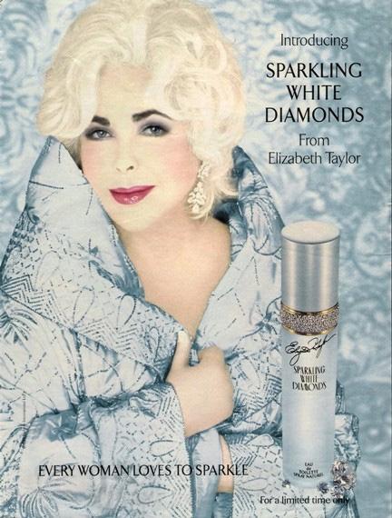 Кампании по продвижению ароматов от Элизабет Тейлор строились главным образом вокруг ее собственного образа. Это отражалось и в сверкающем оформлении флаконов, передающем страсть актрисы к музейным украшениям. Эта страсть описана в ее книге «Мой роман с ювелирными изделиями», опубликованной в 2002 году. В книге рассказывается, например, как Тейлор чуть не потеряла жемчужину La Peregrina, которую можно увидеть на портрете Марии Тюдор. Жемчужину чуть не проглотила одна из собак актрисы. Для продвижения White Diamonds потребовался мужской имидж – и были привлечены Кенни Роджерс и Барт Бейнолдс, которые появились в рекламе вместе со слоганом «я никогда не забуду женщину в бриллиантах…».