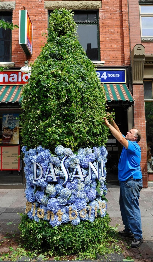 На этот раз рекламные скульптуры были установлены в центре Монреаля, напоминая прохожим, что Dasani в своем маленьком зеленом камуфляже не только близок к природе, но и находится в полной гармонии с инновационной продукцией.