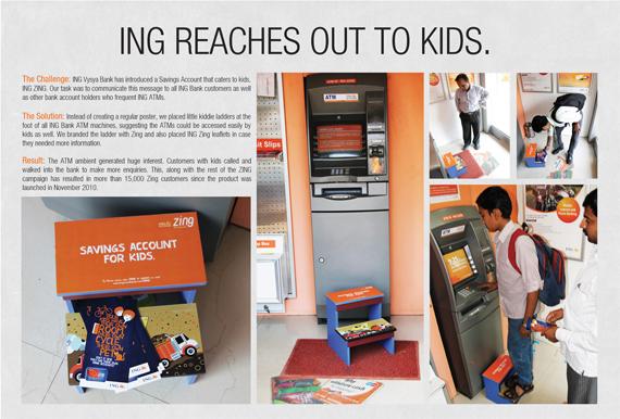 В ING Vysya Bank заявили, что теперь их услуги легко доступны даже детям. А чтобы подчеркнуть это, ко всем банкоматам банка приставили маленькие детские лестницы. Так банк решил прорекламировать свою новую услугу – ING ZING