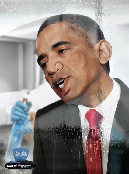 Лицами Обамы, Саркози и королевы Елизаветы вытерли стекла в рекламе салфеток
