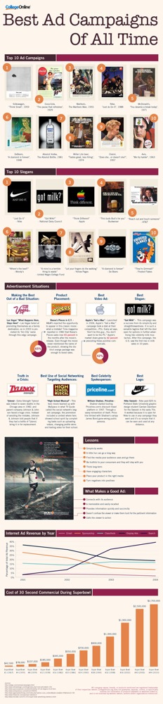 Если вы хотите знать, какая рекламная кампания была самой успешной за все время существования рекламной индустрии, или как менялась стоимость 30 рекламных секунд в трансляции Суперкубка, то вам стоит изучить инфографику на сайте CollegeOnline