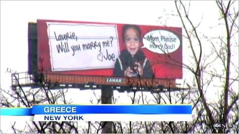 Джо Феррари сделал своей подружке Лори Гвидайс предложение с помощью рекламного щита. Джо и Лори прожили вместе уже шесть лет, у них есть полуторагодовалый сын Луис