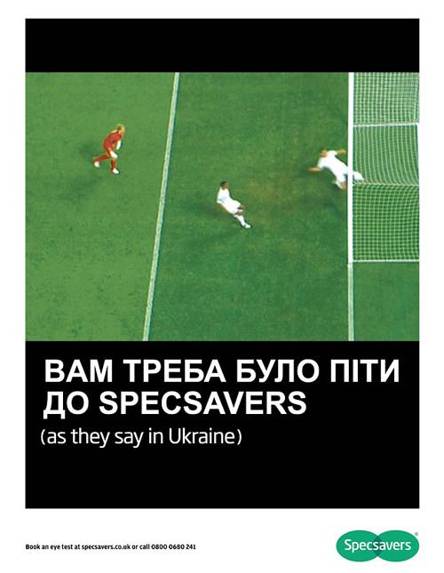 На принте размещена фотография незасчитанного гола, а внизу надпись на украинском языке, как бы обращаясь к горе-судье: 'Вам надо было пойти к Specsavers'. Еще ниже приписка на английском: 'Как говорят в Украине'. И уже под текстом рекламы предложение пройти тест на зрение.
