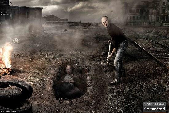 Как правило, подразумевается, что имена и лица, еще недавно мелькавшие во всех заголовках, очень быстро оказываются забытыми, а им на смену приходят новые. Однако чилийцы трактовали крылатое выражение буквально и выпустили серию пугающих рекламных плакатов. На них различные известные деятели живьем закапывают друг друга в неглубоких могилах, тем самым давая понять, что для похороненных заживо пришло время быть забытыми.