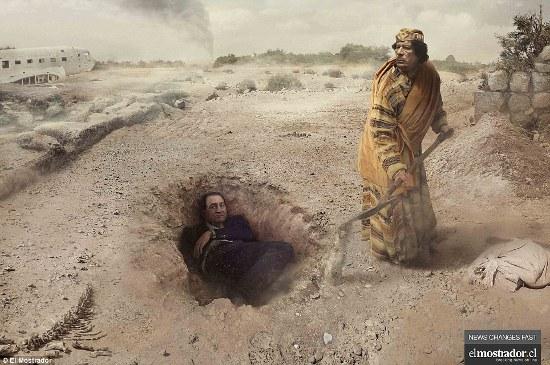 На другом изображении свергнутый ливийский диктатор Муаммар Каддафи в пустыне хоронит другого павшего лидера – бывшего президента Египта, Хосни Мубарака.