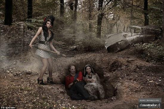На одном изображении погребенными живьем оказались принц Уильям и его жена Кейт. Закапывает их погибшая молодой Эми Уайтхаус.