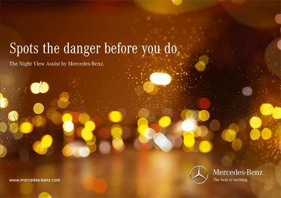 Здесь рекламируется новая опция Night View Assist, которая теперь есть в автомобилях марки «Мерседес».