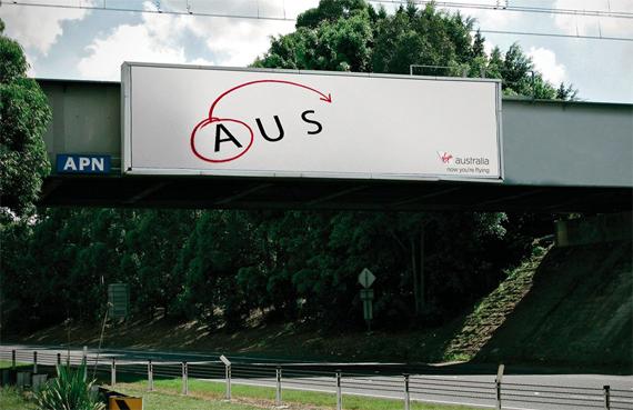 Просто и очень симпатичный билборд рекламирует регулярные рейсы из Австралии (AUS) в США (USA).