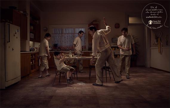 Эта социальная реклама буквально иллюстрирует цикличность домашнего насилия. Рекламный текст сообщает следующее: «70% детей, пострадавших от домашнего насилия, сами становятся тиранами. Сделайте пожертвование на savethechildren.mx. Прервите этот порочный круг».