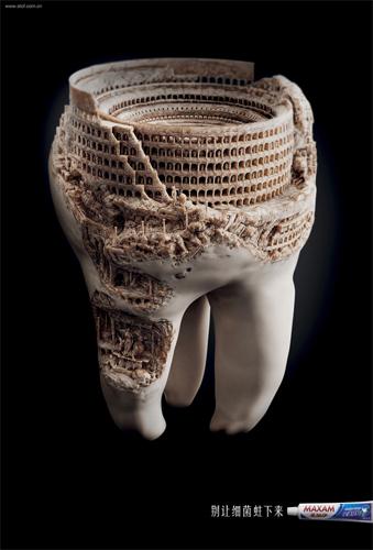«Не позволяйте микробом обосноваться здесь», - говорится в этой рекламе, демонстрирующей руины античных городов внутри зуба. Кампания также заработала золото в категории Press.