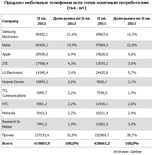 Объем продаж мобильных телефонов всех типов конечным потребителям во II квартале 2012 г. сократился на 2,3% в сравнении с аналогичным периодом прошлого года до 419 млн штук, сообщает Gartner. Доля смартфонов в общем объеме проданных в период с апреля по июнь мобильных телефонов возросла до 42,7% по сравнению с 36,7% годом ранее. Компания Samsung Electronics, которая по итогам I квартала 2012 г. вышла на первое место по объему поставок мобильных телефонов на рынок (ранее в течение 14 лет это место принадлежало Nokia), во II квартале укрепила рыночные позиции по отношению к Nokia (второе место) и Apple (третье место). Доля корейского вендора возросла с 16,3% в прошлом году до 21,6%. Успех Samsung обусловлен высокими продажами смартфонов Galaxy. В указанный период компания продала рекордное количество смартфонов. По данным Gartner, во II квартале 50,4% всех проданных Samsung на глобальном рынке мобильных устройств составили смартфоны. Доля Nokia продолжила сокращаться и опустилась до 19,9% по сравнению с 22,8% годом ранее. Доля Apple возросла с 4,6% до 6,9%. Компания HTC сократила свою долю в общем объеме проданных мобильных телефонов с 2,6% до 2,2%, Motorola - c 2,4% до 2,2%, Research In Motion - с 3% до 1,9%. Вместе с тем компании ZTE, Huawei Device и TCL Communications укрепили позиции.