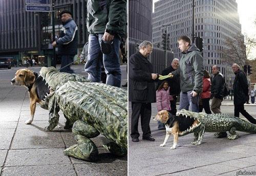 Оригинальная идея — молодой человек гуляет со своей проглоченной собакой и раздает на улице листовки с надписью «Приходи к нам в зоопарк, пока зоопарк не пришел к тебе».