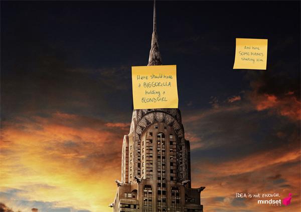 Реклама выполнена в виде трех плакатов под общим слоганом «Одной идеи недостаточно» (Idea is not enough). Главная мысль – даже хорошая идея нуждается в грамотном воплощении. Очевидно, в пример ставится продукция рекламируемой кинокомпании. На всех постерах – примеры из знаменитых фильмов. Только вместо реальных кадров видны лишь надписи с идеями. Смотрится довольно забавно.